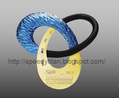 | Finisher's Medal is made with metal with the segment representing the BIKE Leg covered with rubber. The segments for the swim and run legs are all METAL. |
